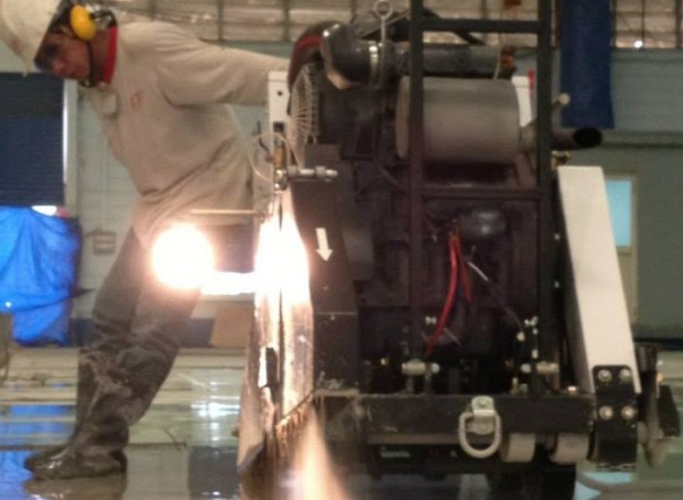 งานตัดพื้นด้วยรถตัดถนน (Floor Saw หรือ Flat Saw หรือ Walk Behind Saw) สามารถตัดพื้นได้ลึกถึง 400mm. เครื่องยนต์ดีเซล ขนาด 48 แรงม้า เร็วกว่าการตัดโดยใช้เครื่องมือประเภทอื่น รถตัดสามารถเดินหน้าและถอยหลังได้ด้วยตัวเอง ควบคุมได้ง่าย ไม่มีฝุ่นจากการตัดเนื่องจากใช้น้ำเลี้ยงใบ ทำให้งานจบไวกว่าการทำงานโดยใช้เครื่องมือประเภทอื่น